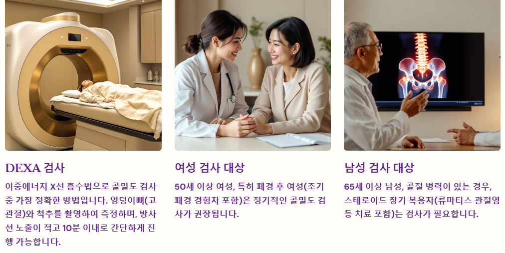 ✔ 골밀도 검사는 50세 이후 정기적으로 받아야 하며, 특히 폐경 후 여성은 필수