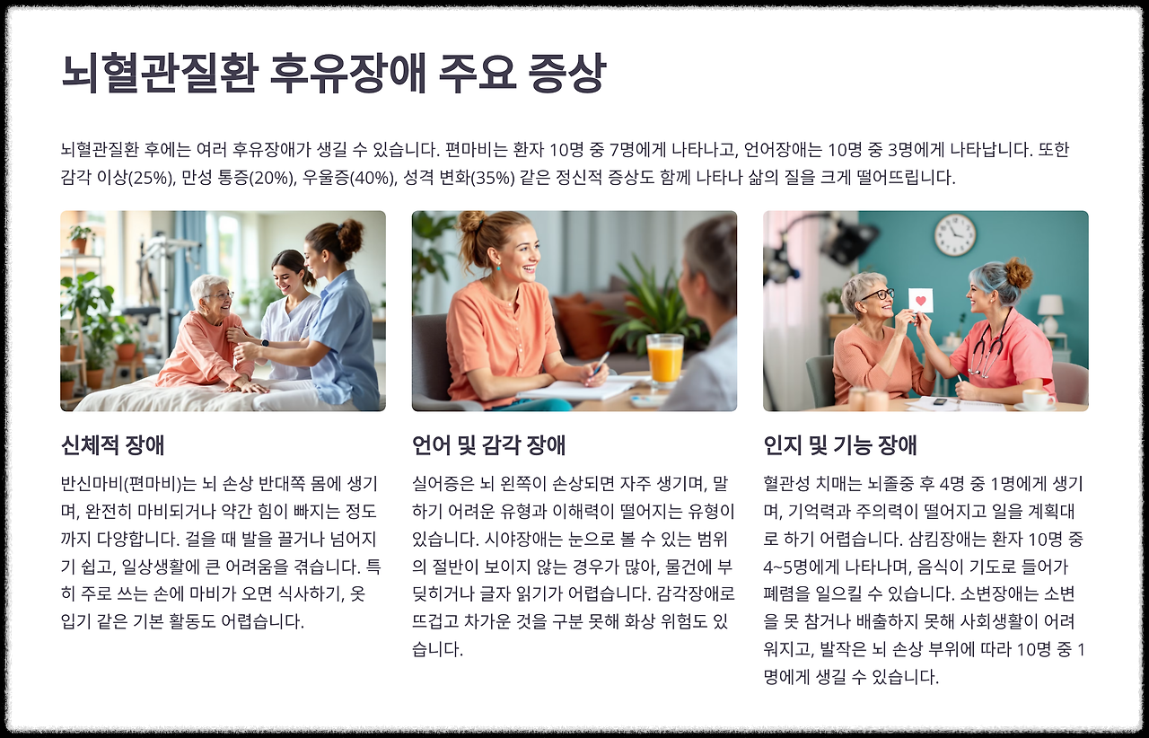 뇌혈관질환 후유장애는 발병 자체도 무섭지만, 그 이후 남는 장애로 인해 환자 본인과 가족 모두에게 큰 어려움을 안겨줄 수 있습니다.