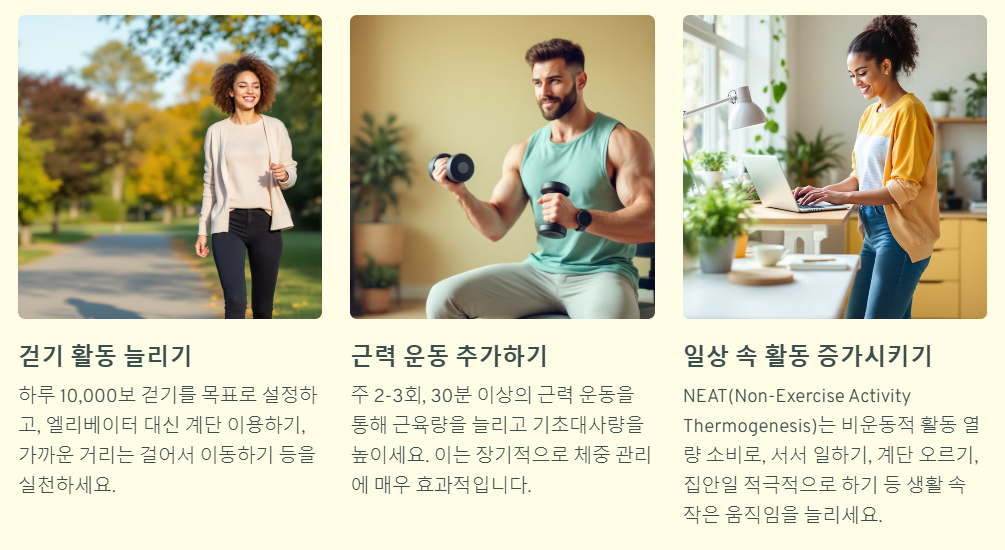 - 근력 운동: 근육량을 늘려 기초대사량 증가