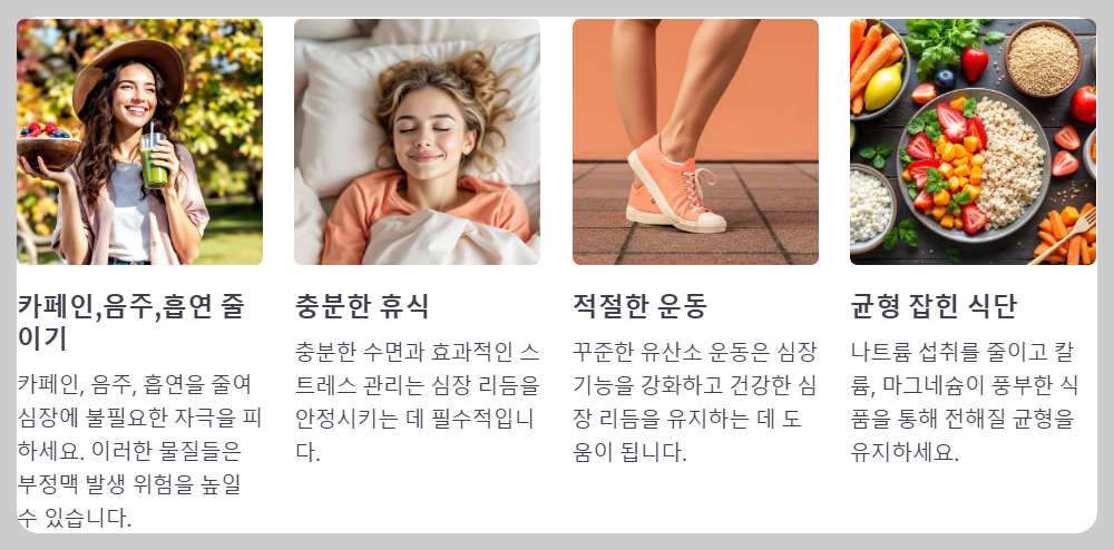 특히 부정맥 진단을 받았다면 정기적인 병원 진료와 약물 복용을 철저히 지켜야 하며, 무리한 운동이나 과도한 스트레스는 피해야 합니다.