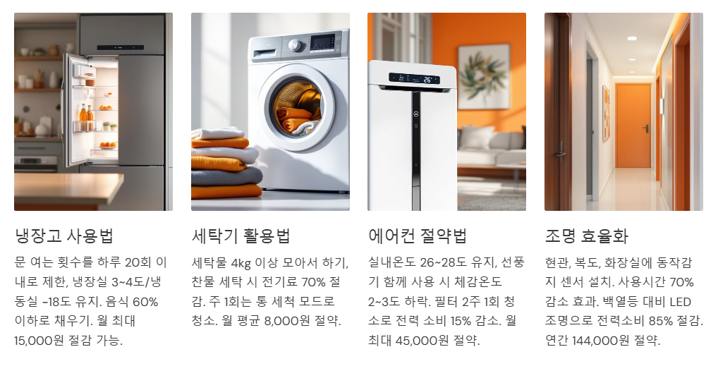 - 방마다 LED 조명으로 교체하면 연간 전기요금을 5~10만 원 이상 절약할 수 있습니다.