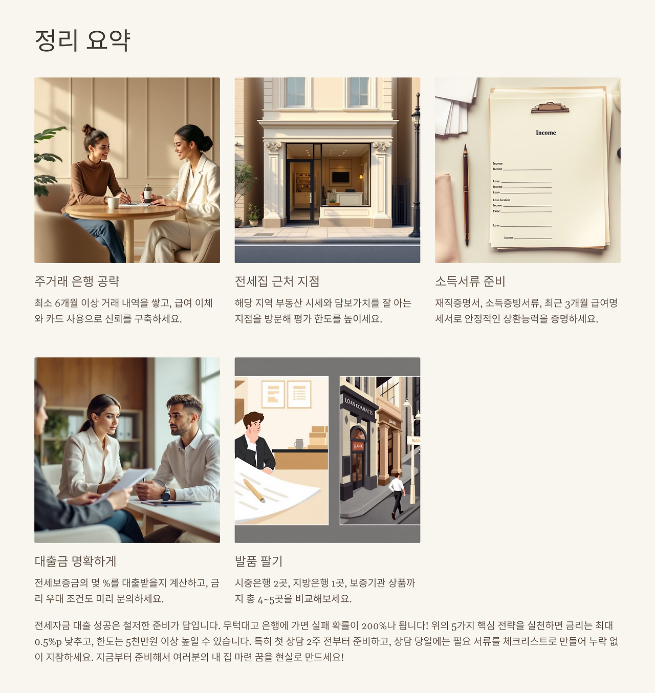 특히 주거래 은행 공략, 전세집 근처 지점 방문, 소득 서류 완벽 준비, 대출금 명확화, 발품 팔기 이 5가지는 무조건 챙겨가세요.