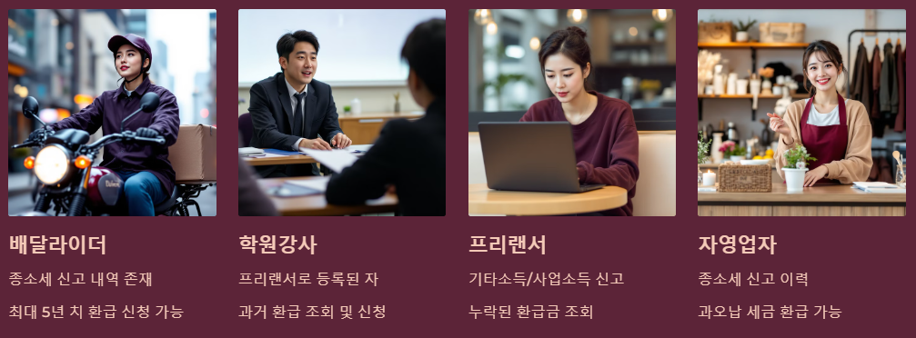 | 배달라이더 | 인적용역 소득자 | 종소세 신고 내역 존재 | 최대 5년 치 환급 |