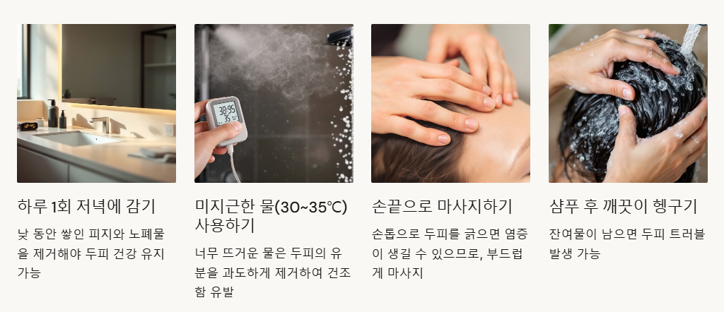 - 낮 동안 쌓인 피지와 노폐물을 제거해야 두피 건강 유지 가능