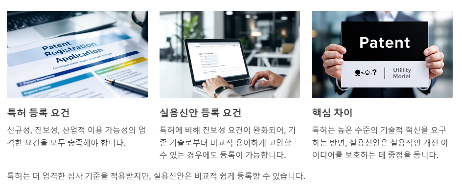 | 등록 요건 | 신규성, 진보성, 산업적 이용 가능성 필요 | 신규성, 산업적 이용 가능성 필요 (진보성 완화) |
