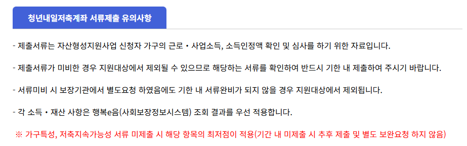 | 온라인 | 복지로 홈페이지 접속 → 회원가입 및 로그인 → ‘청년내일저축계좌’ 검색 후 신청 |
