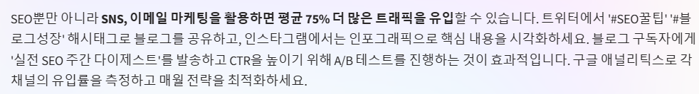 ✔ 첫 문단에서 키워드 포함 → "블로그 트래픽을 늘리기 위해선 SEO 최적화가 필수입니다."