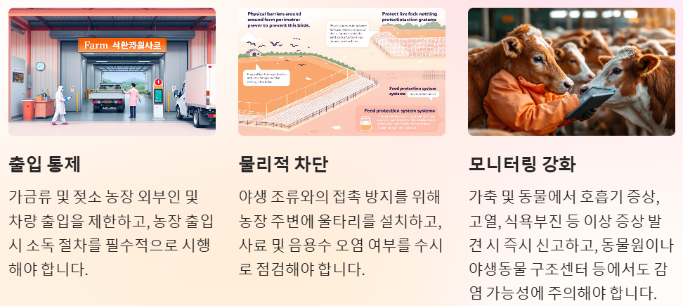 ✔ 가축 및 동물에서 호흡기 증상, 고열, 식욕부진 등 이상 증상 발견 시 즉시 신고