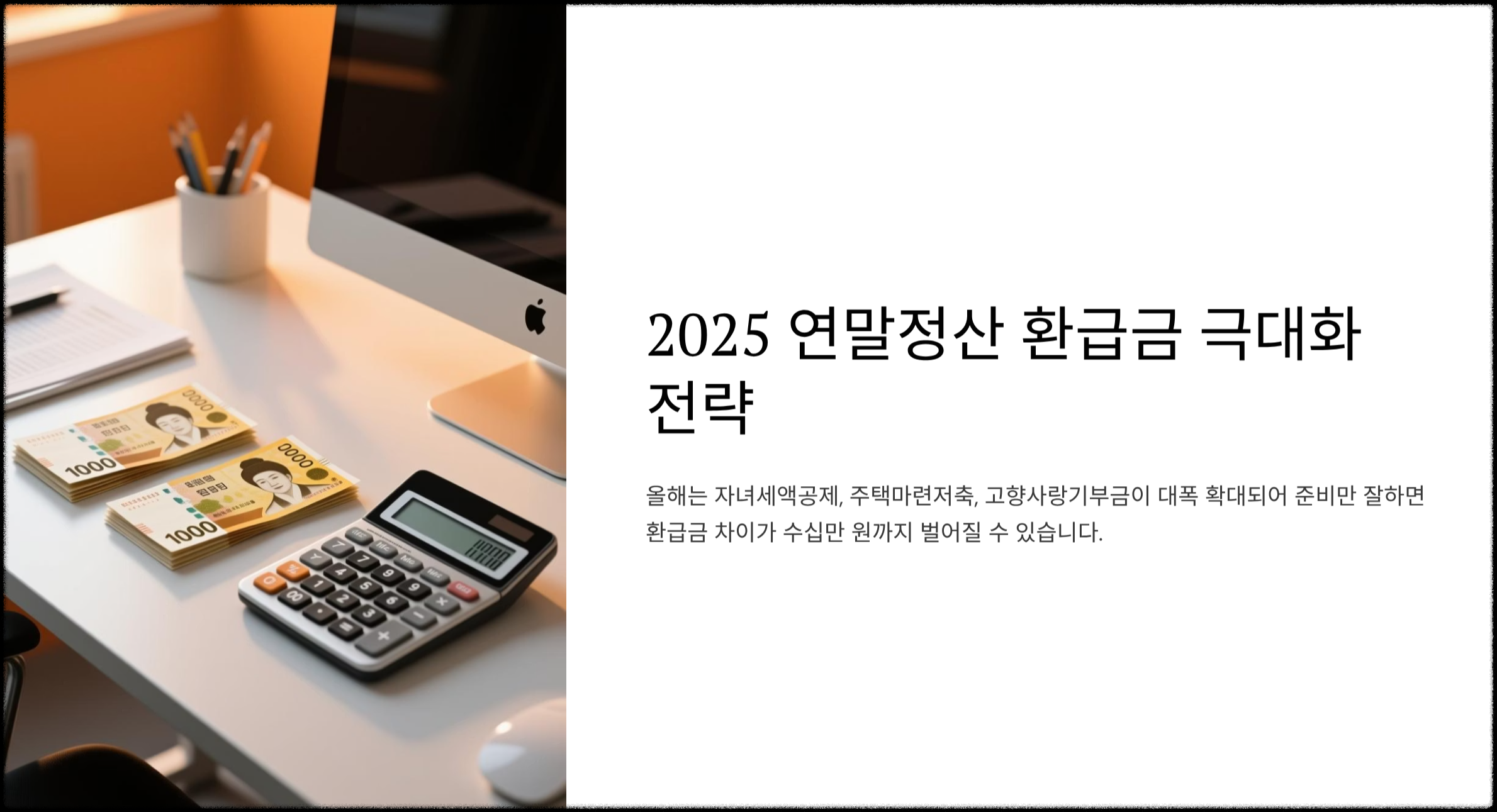 올해는 특히 자녀세액공제, 주택마련저축 공제, 고향사랑기부금 공제가 대폭 확대되면서, 준비만 잘하면 환급금 차이가 수십만 원까지 벌어질 수 있습니다.
