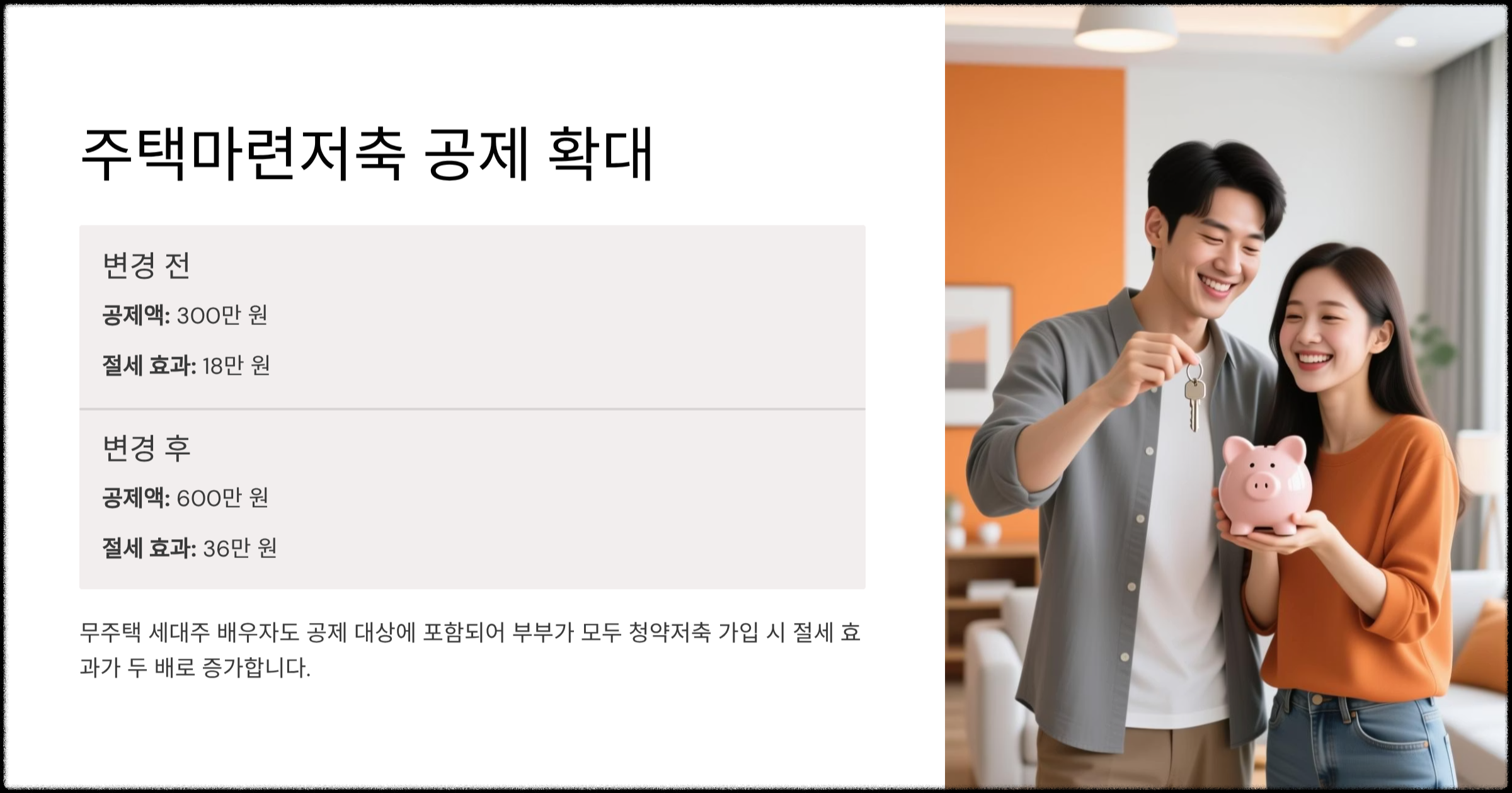 부부가 모두 청약저축에 가입 시, 세대당 18만 원 → 36만 원 절세 가능